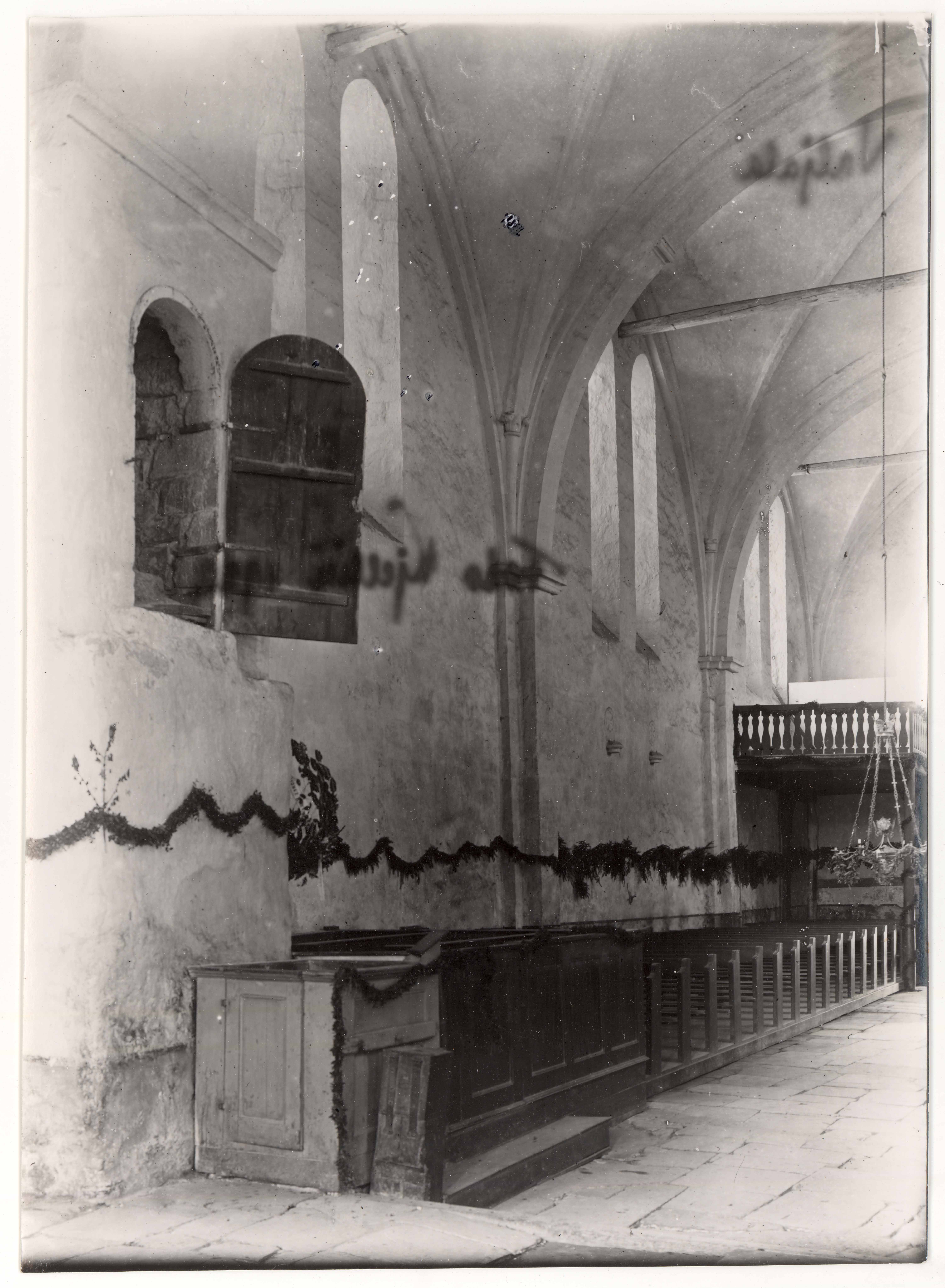 Valjala Martini kiriku kooris vaade S-seinale. Paremal põrandast kõrgemal asuv uks, mis viib võlvidele