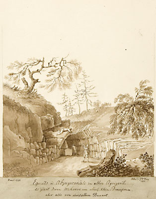 Itaalia, Sitsiilia, kohavaated, baltisaksa, kunst, koopiad, joonistus, seepia (kunst), 19. saj., 1820-ndad, tušijoonistus