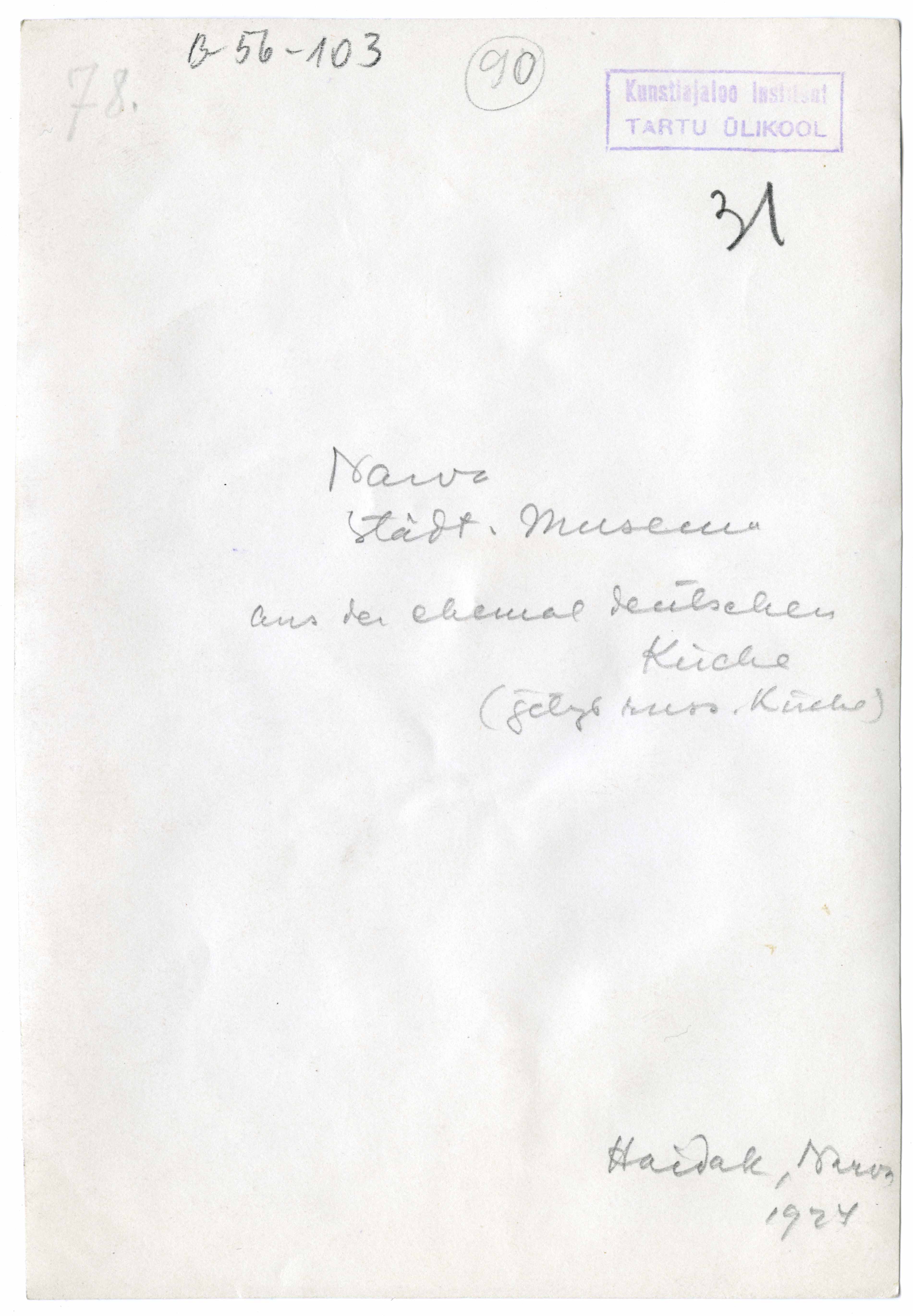 Tekst foto tagaküljel: Narva. Städt. Museum aus der ehema deutschen Kirche (jetzt russ. Kirche) Haidak, Narva 1924. Tempel: Instituut