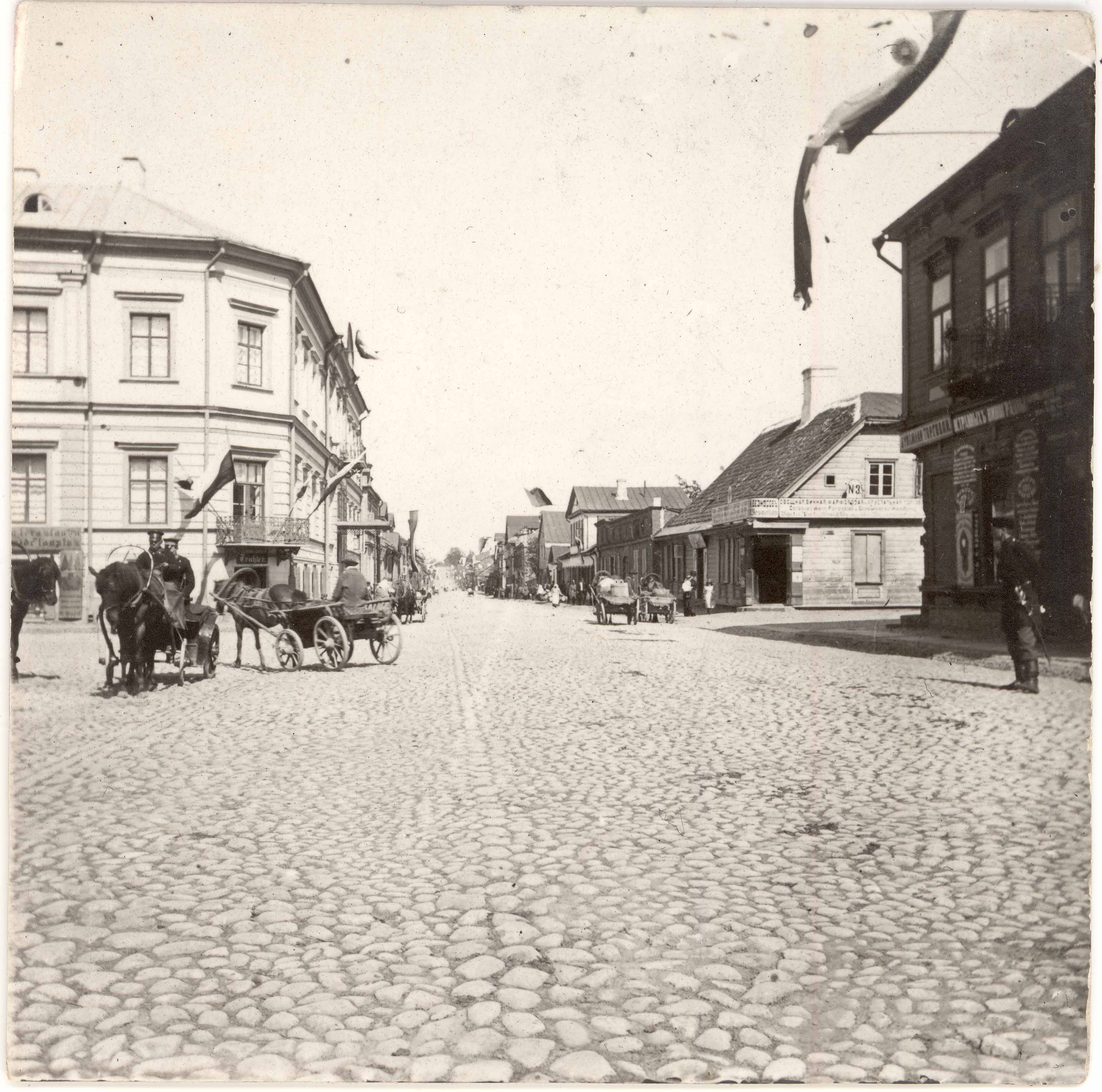 Tartu. Raatuse (Raekoja) tn vaade Henningi platsilt NO suunas. Vasakul maja Raatuse ja Narva mnt nurgal (hävinud).