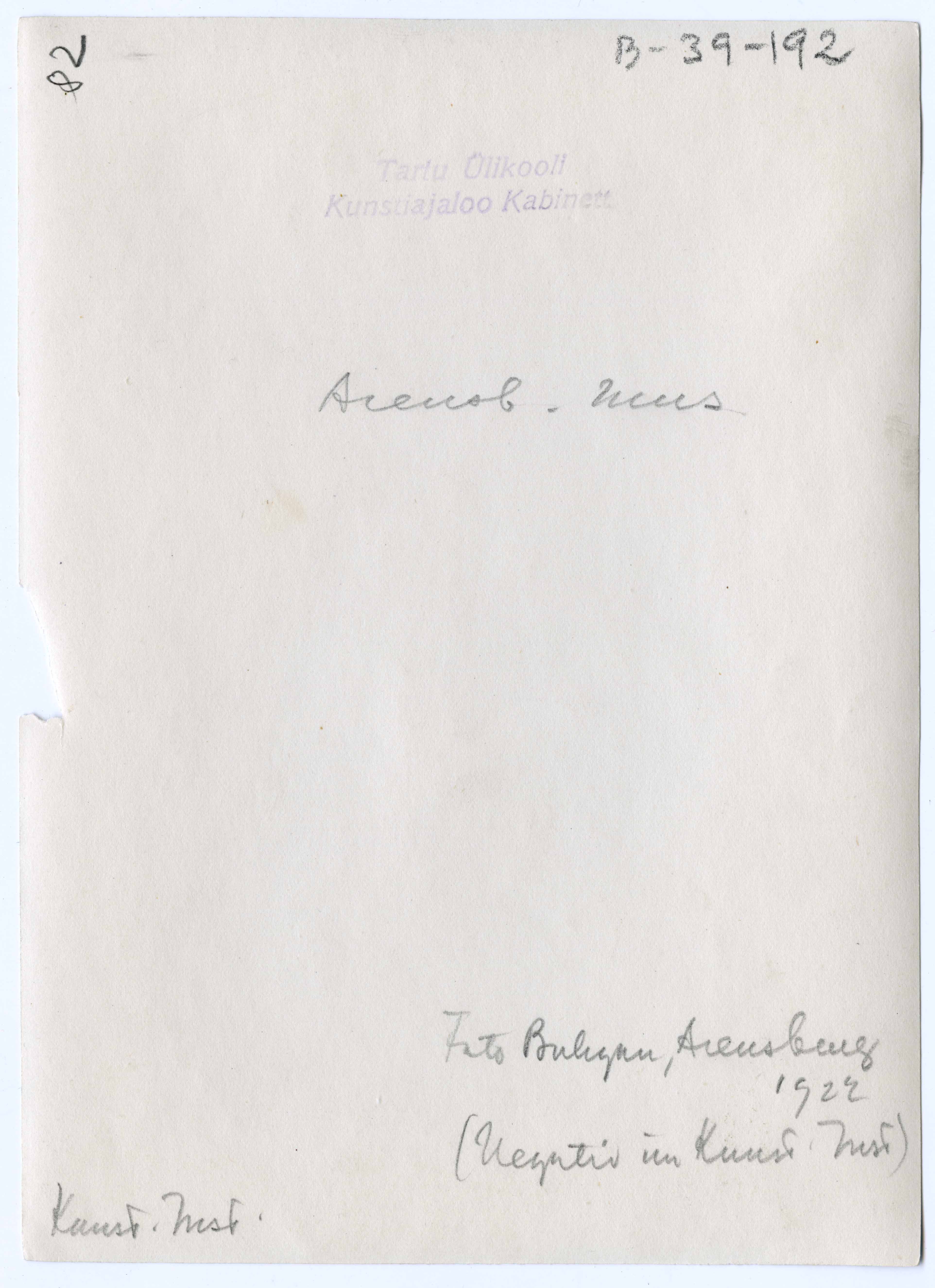 | dc.description | Tekst foto tagaküljel: Arensb. Mus. Foto Buhgan, Arensburg 1922 (negativ im Kunst Inst). Kunst. Inst. Tempel: Kabinett | et |