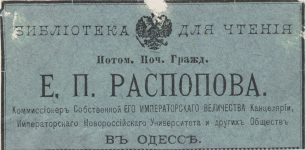Nelinurkses raamistuses: БИБЛIОТЕКА ДЛЯ ЧТЕНIЯ / Потом. Поч. Гражд. / Е. П. РАСПОПОВА. / Коммиссiонеръ [---]