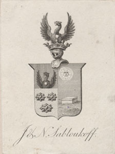 Vapp kaheks jaotatud vapikilbiga. Plaadil all: N&A. Sabloukoff.