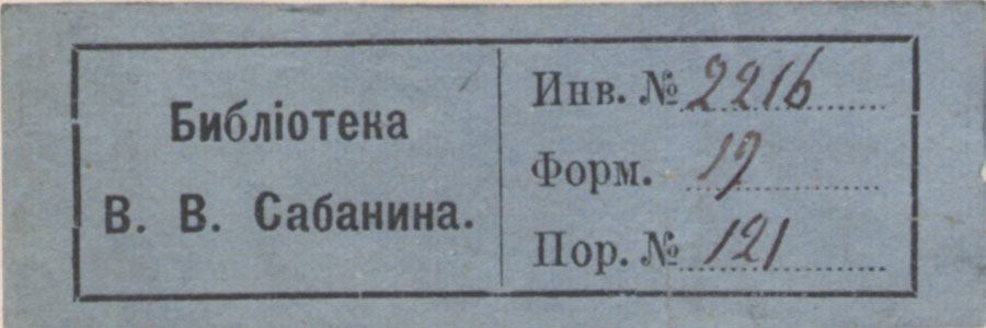 | dc.description | Nelinurkses raamistuses vasakul: Библiотека / В.В. Сабанина. paremal: Инв. № / Форм. / Пор. № | |