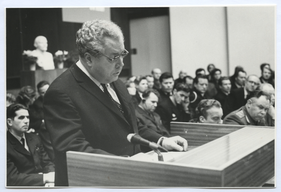 Eesti NSV Ülemnõukogu Presiidiumi esimees Artur Vader kõnelemas Tartu ülikooli aktusel Vanemuise kontserdisaalis