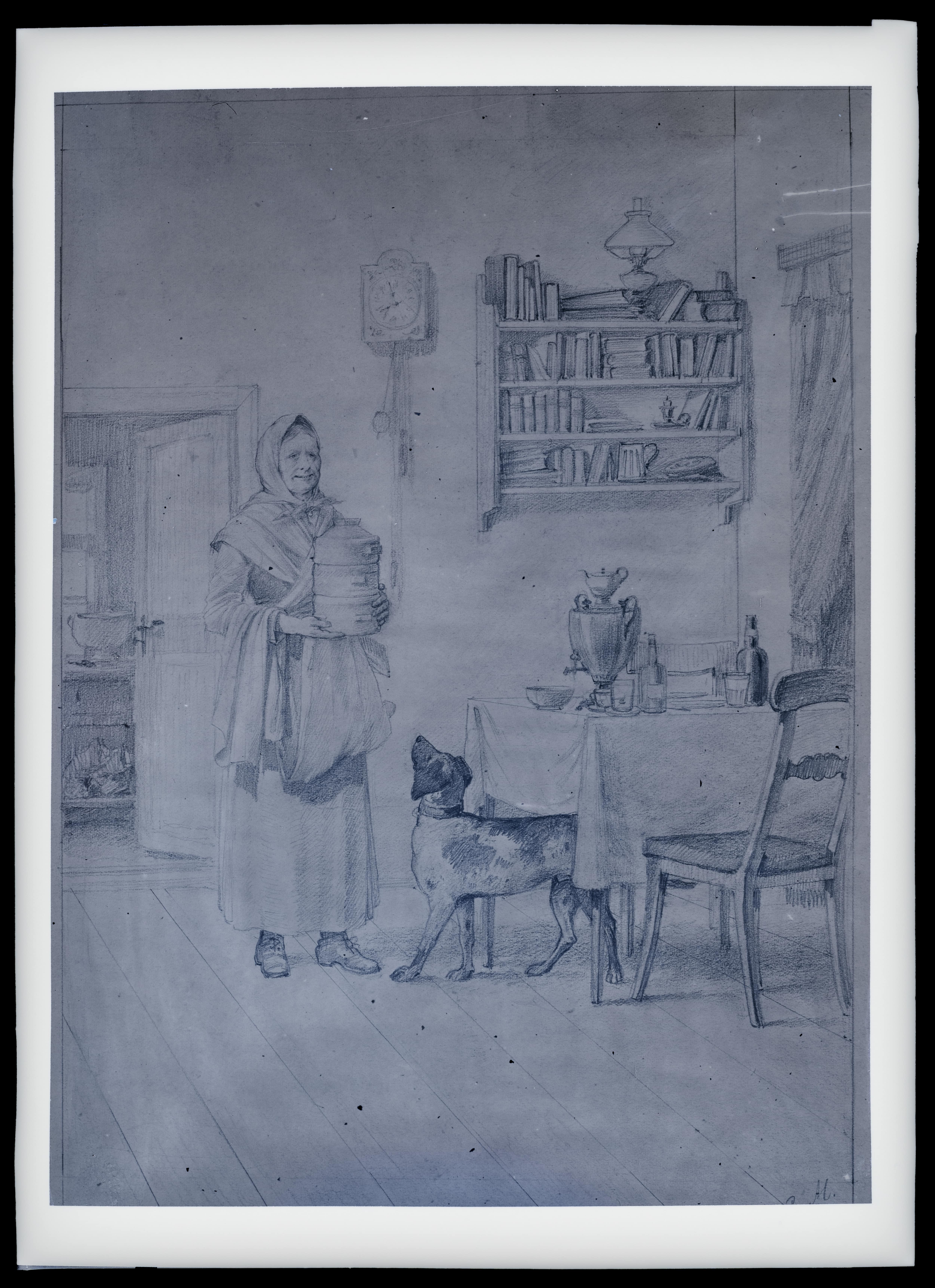 R. J. von zur Mühlen. Dorpater Skizzen. Taluinterjöör vana naise ja koeraga (ERM)
