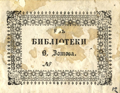 Nelinurkses ornamenteeritud raamistuses tekst: ИЗЪ / БИБЛIОТЕКИ / В. Зотова. / №