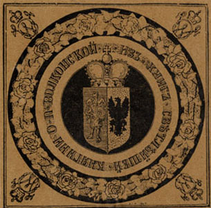 Nelinurkses raamistuses roosidest sõõr ja selle keskel kotka ning tiivulise sõjamehega vapp. Joonises all keskel signeering: У. И. 1904 ümber vapi: ИЗЪ КНИГЪ СВЋТЛЙЋНІЕЙ КНГИНИ О. П. ВОЛКОНСКАОЙ;"Иваск