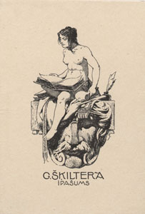 Avatud raamatuga naisakt istumas mehepead kujutaval skulptuuril. Joonises keskel paremal signeering: S. all keskel: G. ŠĶILTERA / IPAŠUMS;"Šķilters