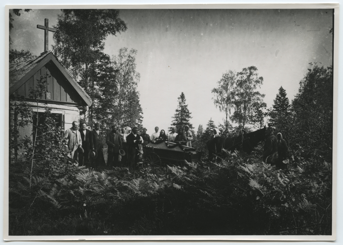 77. Üldvaade hoonetele; 78. Hoone, kus asub kabel; 79. Eluhoone talvel; 80. Teine eluhoone; 81. Kabeli sisevaade; 82. Matused kabeli juures; Neg.83B. Leeprahaige naine voodis