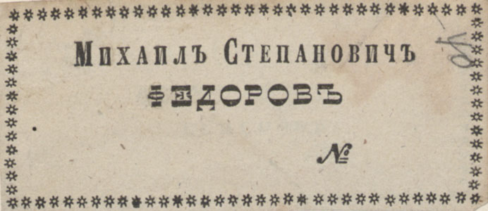 Nelinurkses ornamenteeritud raamistuses keskel: МИХАИЛЪ СТЕПАНОВИЧЪ / ФЕДОРОВЪ / №