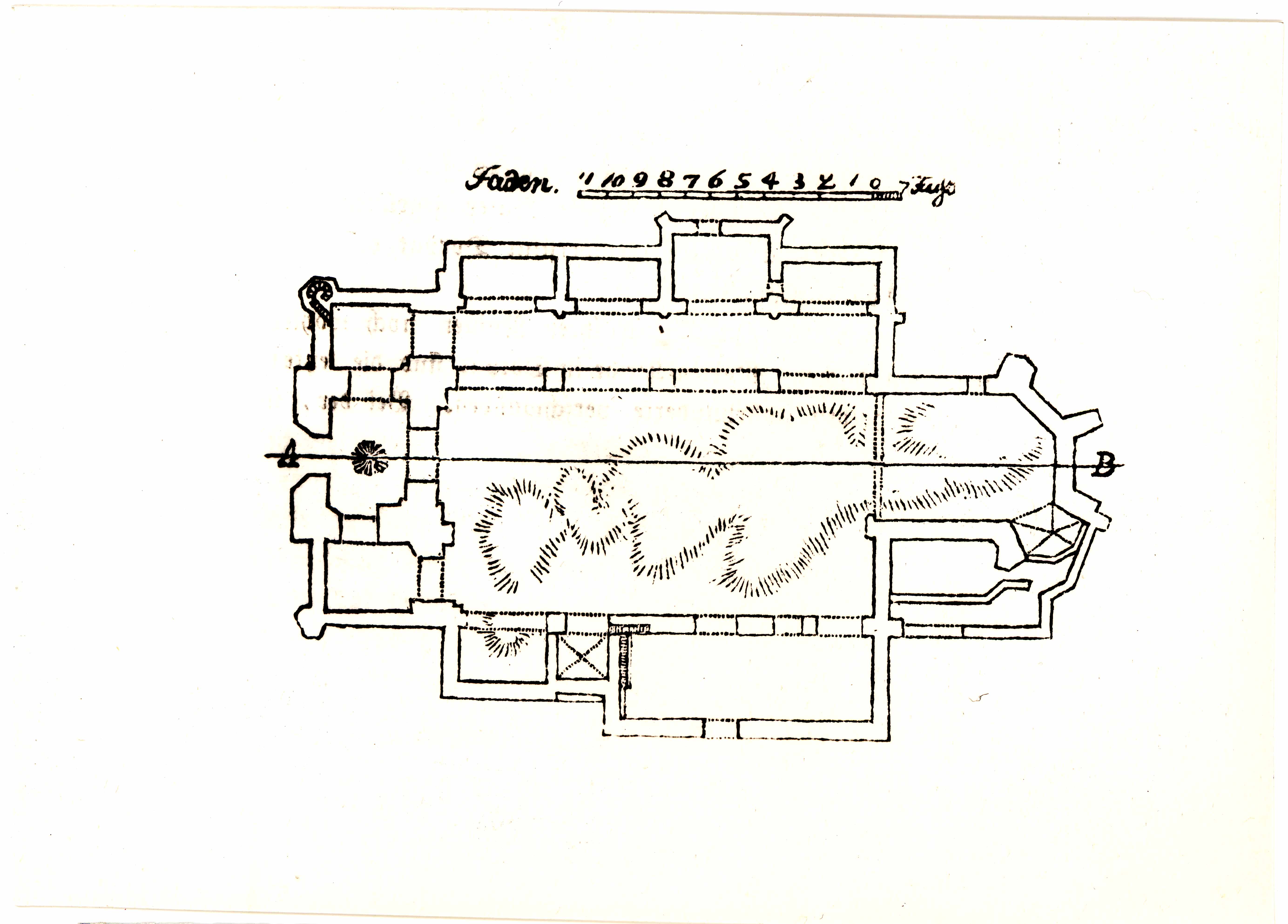 Tartu. (Vana) Maarja kirik (hävinud 1775, lammutatud 19. saj algul). Kiriku põhiplaan 1763.a jooniselt