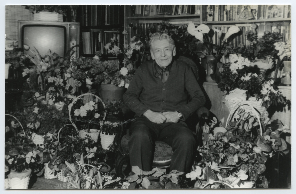 Voldemar Miller oma 70. sünnipäeval lillede keskel. Täisfiguurportree