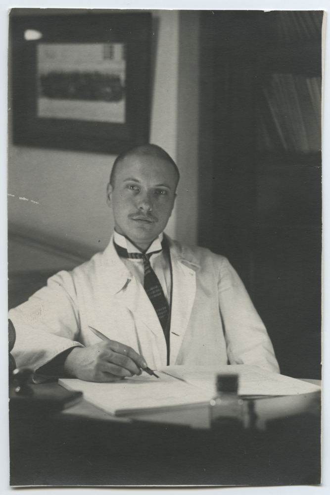 Herbert Normann kabinetis laua taga kirjutamas. Rindportree