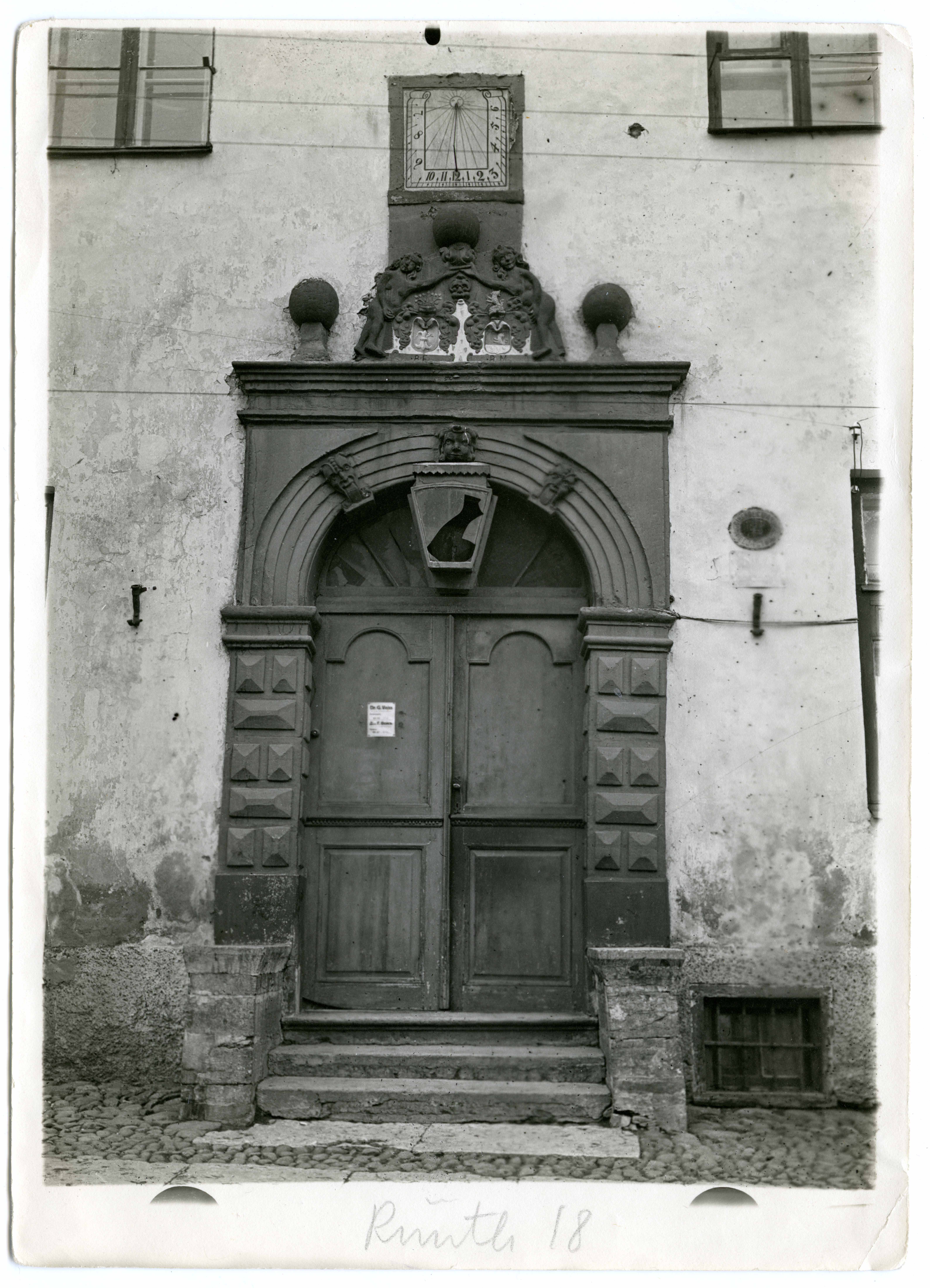Narva. Berndt Erichi maja - nn Vana apteek (1671) Rüütli tn 18 (Raekoja plats). Portaal (1640ndate II p). Eestvaade. Katkine latern