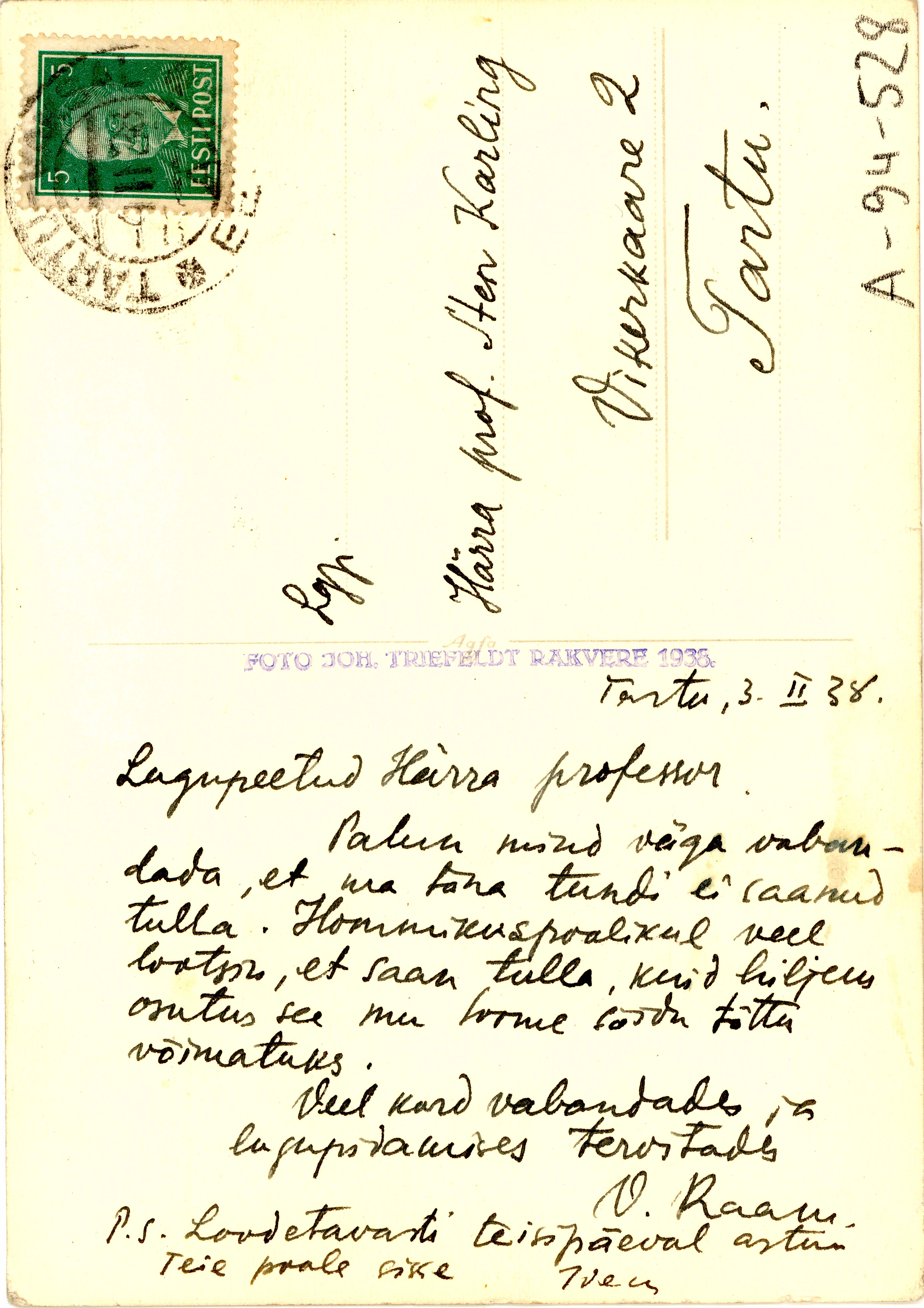 | dc.description | Tekst foto tagaküljel: V. Raami postkaart Sten Karlingile 3 II 38. Tempel: Joh. Triefeldt Rakvere 1938. | et |