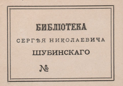 Nelinurkses topeltraamistuses keskel tekst: БИБЛIОТЕКА / СЕРГѢЯ НИКОЛАЕВИЧА / ШУБИНСКАГО / №
