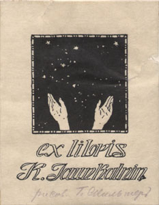 | dc.description | Nelinurkses raamistuses tumeda tähistaeva taustal kaks üles sirutatud kätt. Joonises all: ex libris / K.Jaunkalnin | |