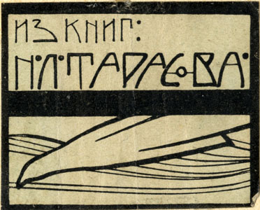 Nelinurkses raamistuses all stiliseeritud lind suunaga paremalt vasakule (Moskva Kunstiteatri embleem). Joonises ülal: ИЗЪ КНИГЪ: / Н. Л. ТАРАСОВА.