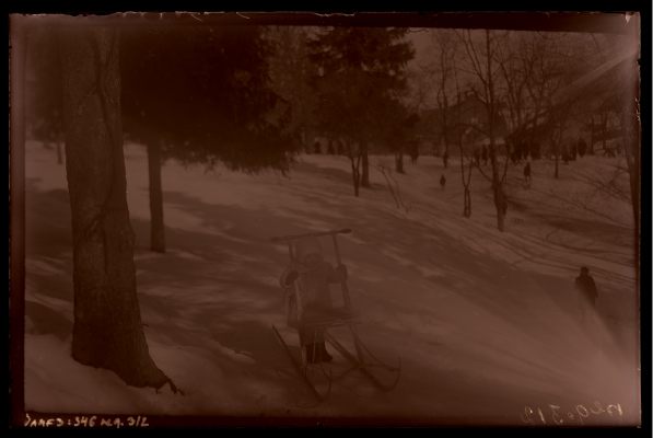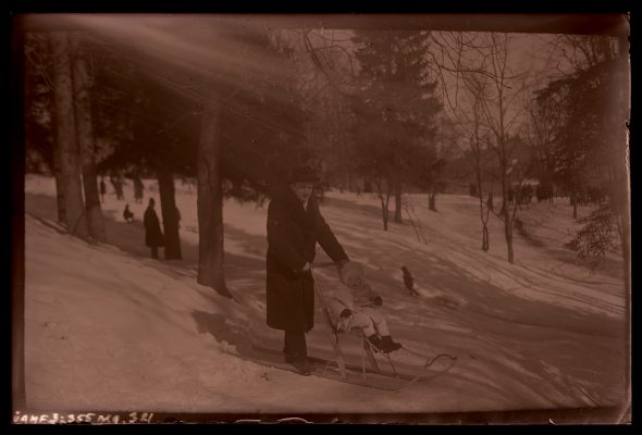 [Tundmatu mees ja väike tüdruk soome kelguga sõitmas]