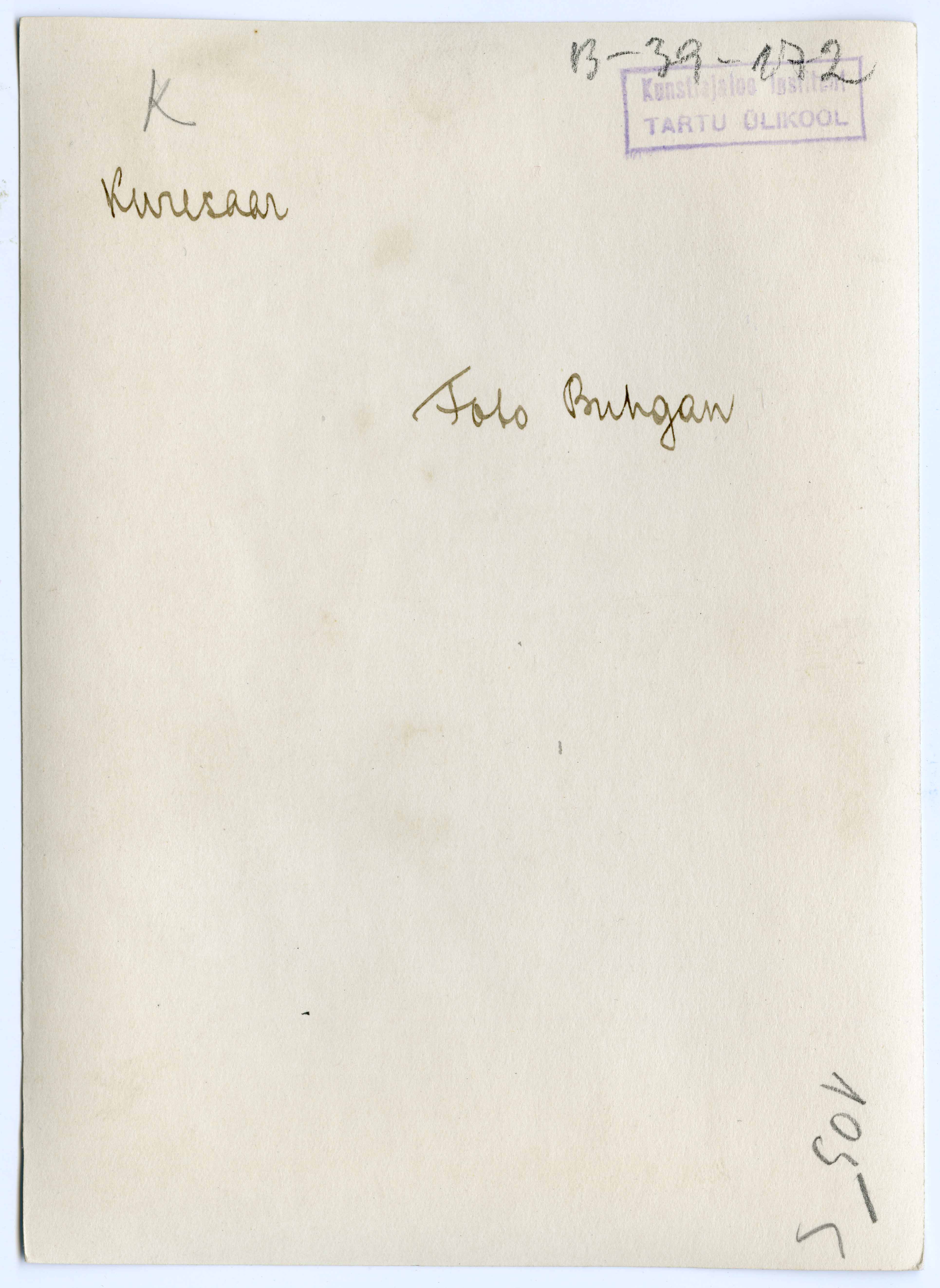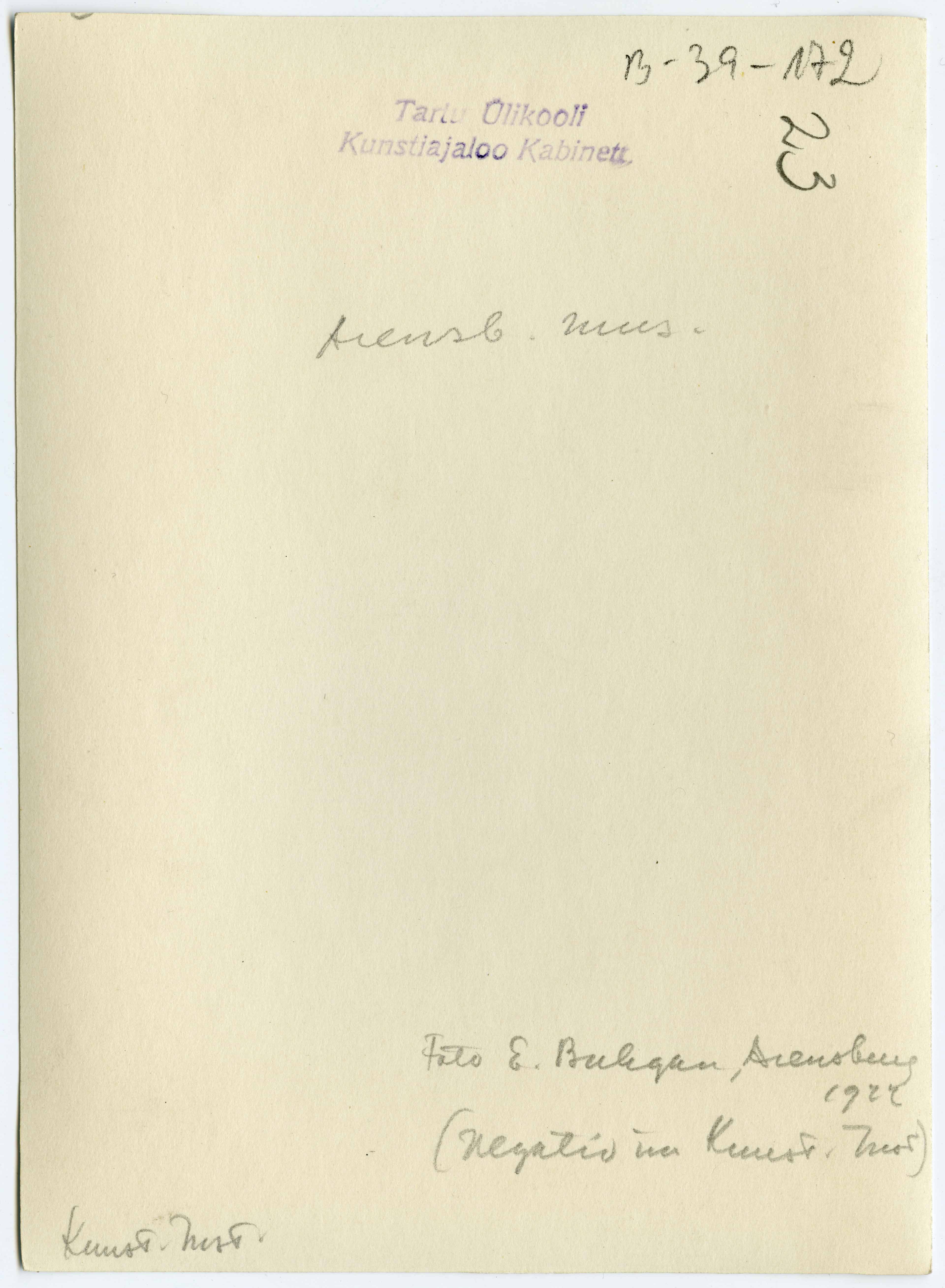 | dc.description | Tekst foto tagaküljel: Arensb. Mus. Foto E. Buhgan, Arensburg 1922 (negativ im Kunst Inst). Kunst. Inst. Tempel: Kabinett | et |