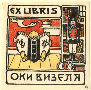 Nelinurkses raamis poiss raamatuga, raamaturiiul ja mängusõdur. Joonises ülal paremal signeering: ФБ all: ОКИ ВИЗЕЛЯ ülal vasakul: EX LIBRIS;"Иваск