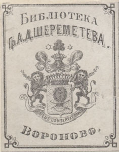 Nelinurkses raamistuses vapp. Joonises ülal: БИБЛIОТЕКА / Гр. А. Д. ШЕРЕМЕТЕВА. all: ВОРОНОВО. keskel vapil deviis: DEUS CONSERVAT OMNIA