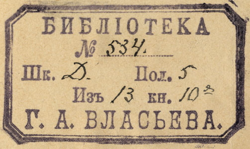 Kaheksanurkses raamis keskel: БИБЛIОТЕКА / № / Шк. Пол. / Изъ кн. / Г. А. ВЛАСЬЕВА.;"Иваск