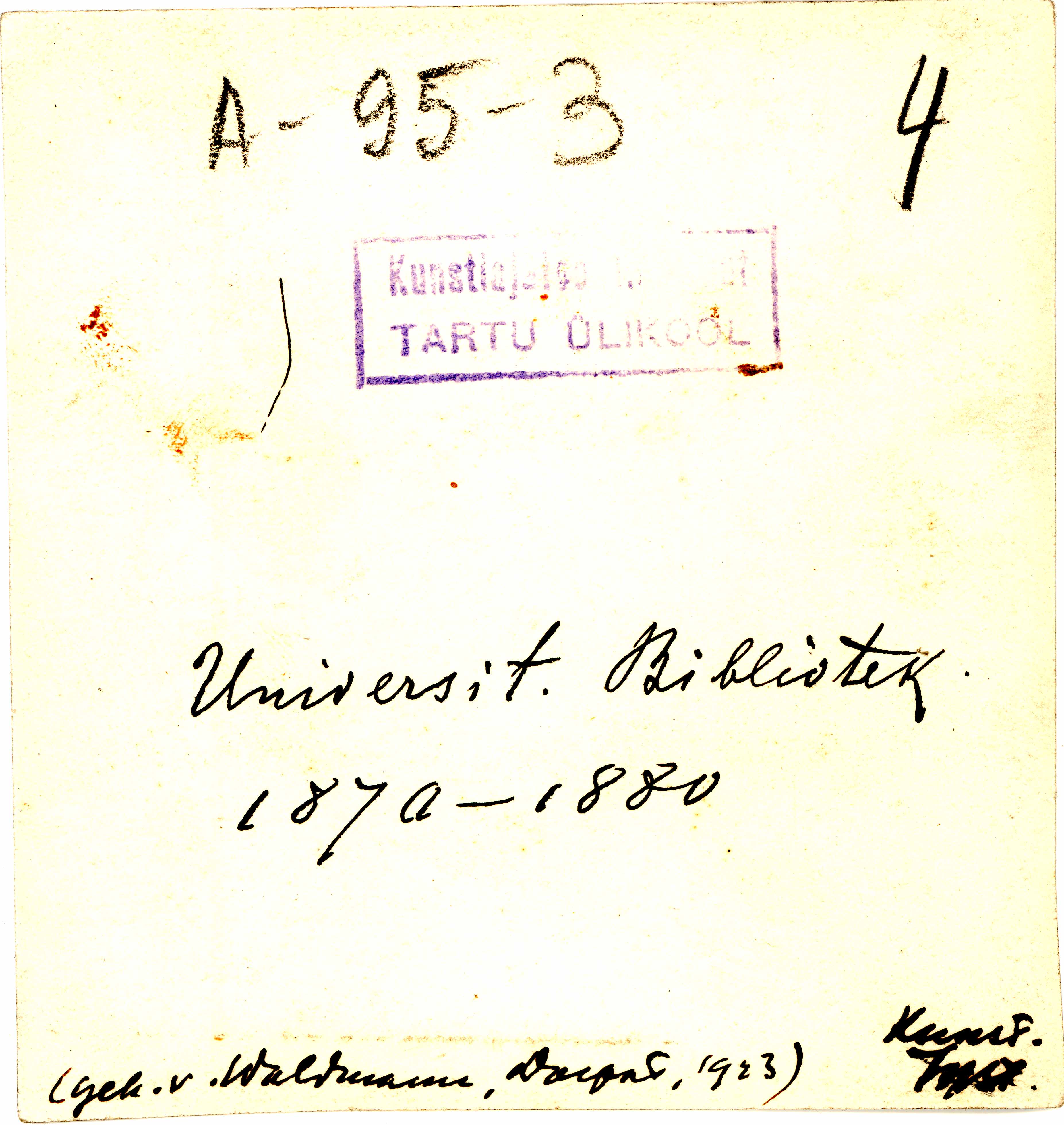 | dc.description | Tekst foto tagaküljel: Universit. Bibliotek. 1870-1880. (gek v Waldmann, Dorpat, 1923) Kunst. Inst. Tempel: Instituut | et |