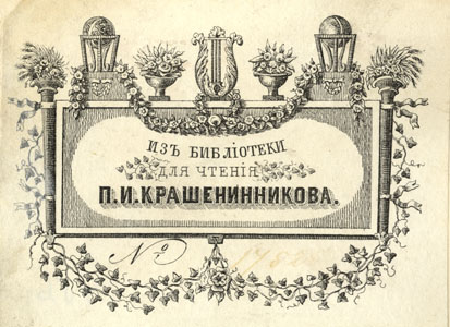 Lillevanikutest ümbritsetud nelinurkne raam, raami kohal lillekimpudega täidetud vaasid ja gloobusi ning lüürat meenutavad dekoratiivsed kaunistuselemendid. Joonises keskel: ИЗЪ БИБЛіОТЕКИ / ДЛЯ ЧТЕНіЯ / П.И. КРАШЕНИННИКОВА. all vasakul: №