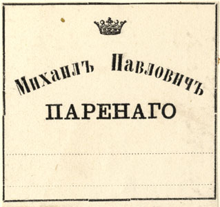 Nelinurkses raamistuses kroon ja tekst: МИХАИЛЪ ПАВЛОВИЧЪ ПАРЕНАГО
