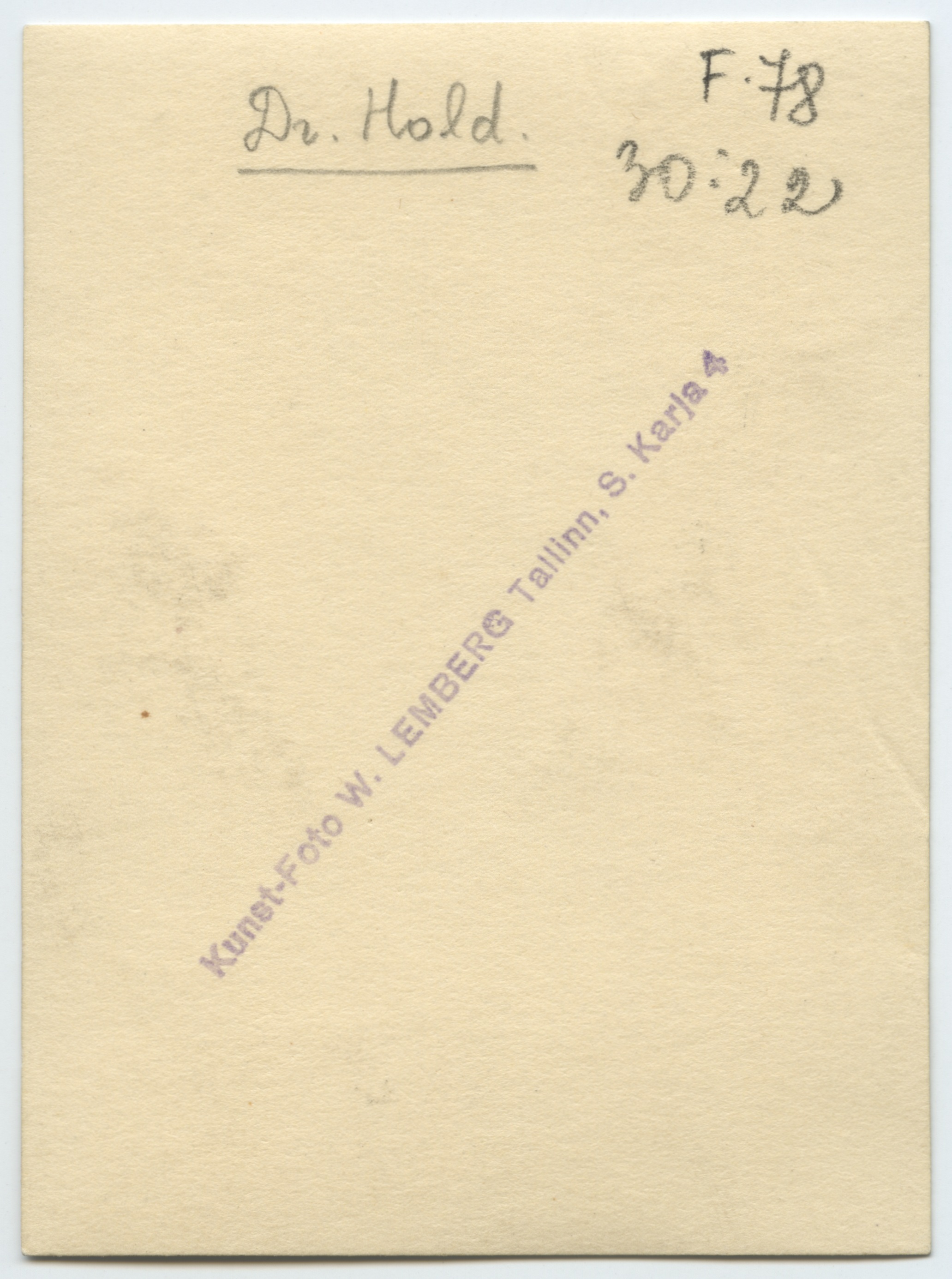 Foto pöördel Valter Lembergi fotoateljee tempel: Kunst-Foto W. LEMBERG Tallinn, S. Karja 4