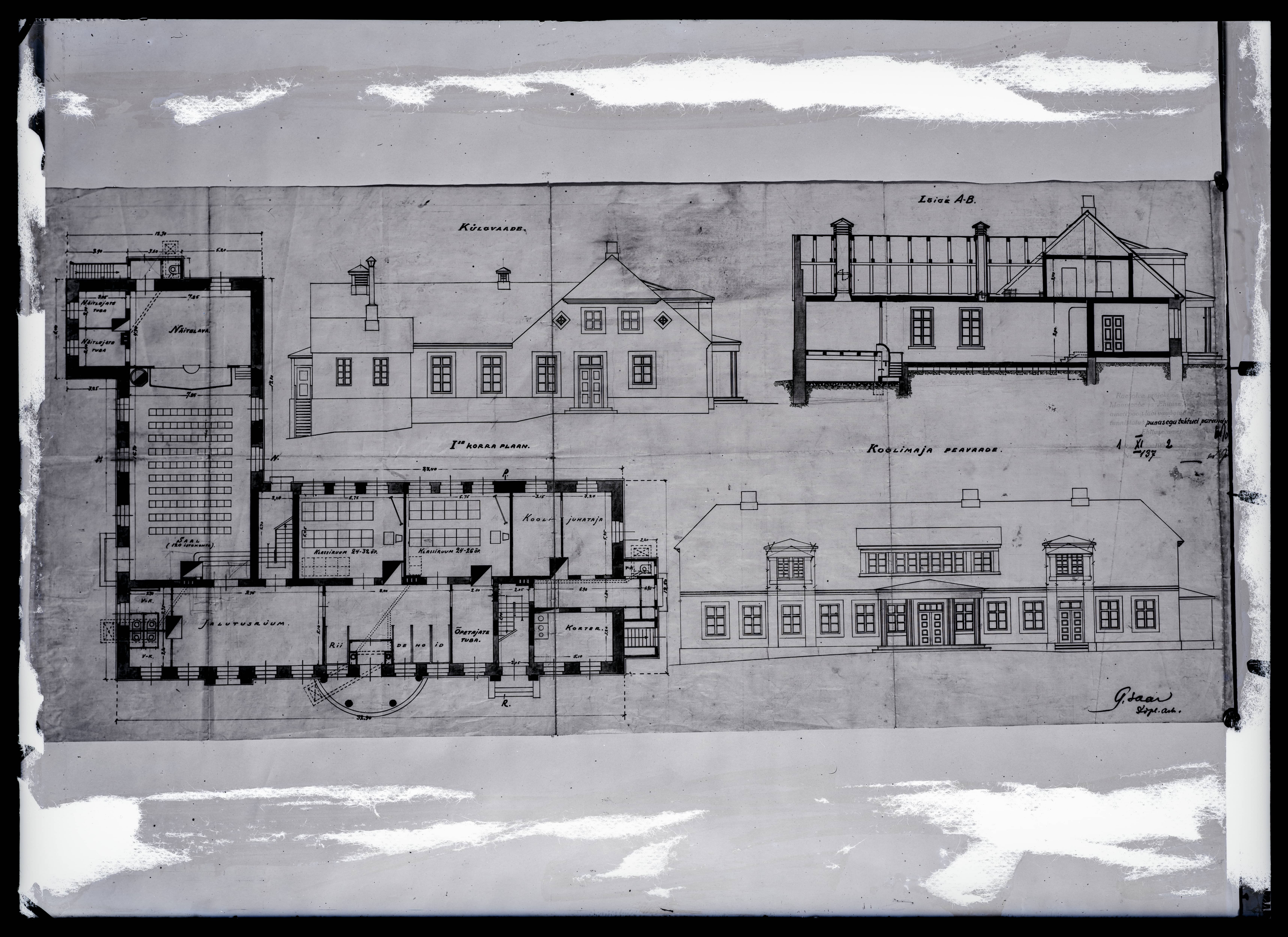 Iigaste mõisa härrastemaja 1. ja katusekorruse põhiplaanid, külg- ja eestvaated ning läbilõige pärast ümberehitust koolimajaks
