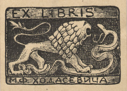 Nelinurkses raamis lõvi ja madu. Joonises all: М. Ф. ХОДАСЕВИЧА. ülal: EX LIBRIS;"Иваск