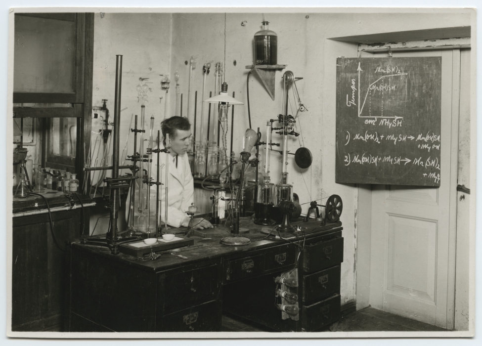 Assistent Aleksander Sinka Tartu ülikooli anorgaanilise keemia laboris laua ääres töötamas