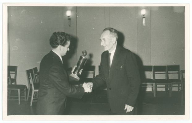 Eesti Raadio reporter Heino Lupp annab prof. Mihkel Kasele tema 60. sünnipäeva puhul üle hõbedase mikrofoni