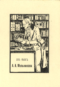 | dc.description | Nelinurkses raamistuses külgvaates vasakule seisev prillidega meesfiguur raamatut lugemas, tagaplaanil raamaturiiul. Joonises all vasakul nelinurkses raamistuses: ИЗЪ КНИГЪ / А.А. Мельникова | |