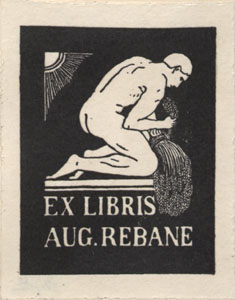 | dc.description | Põlvitav meesakt viljavihku sidumas, ülal vasakul päike. Joonises all: EX LIBRIS / AUG. REBANE | |