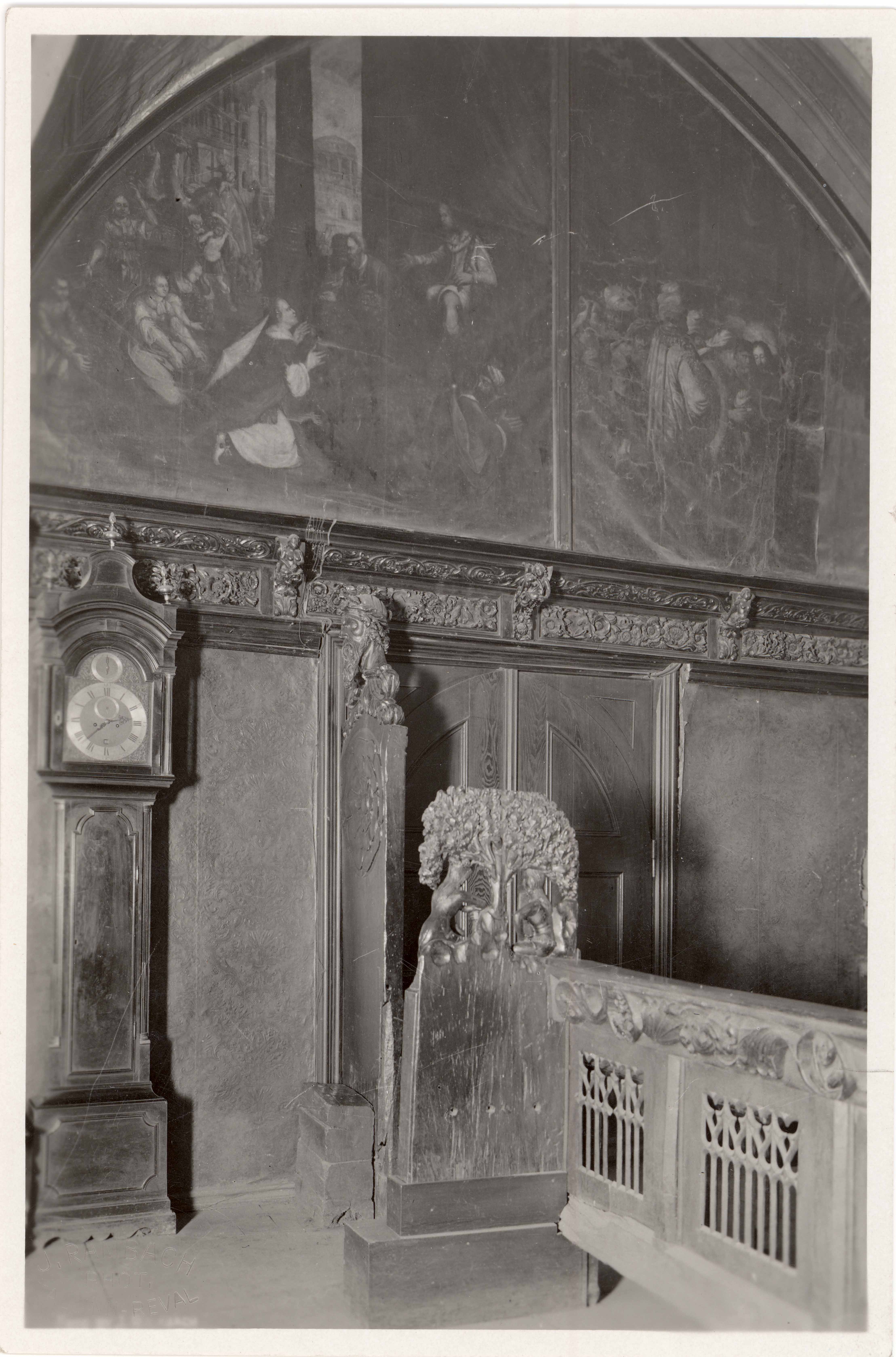 Tallinn. All-linn. Raekoja raesaal. Ees osa raepingist. Tristan ja Isolde puu all, puunikerdus 15. saj lõpust, keskel kaaruks, mille kohal maal, vasakul kappkell 19. saj algusest