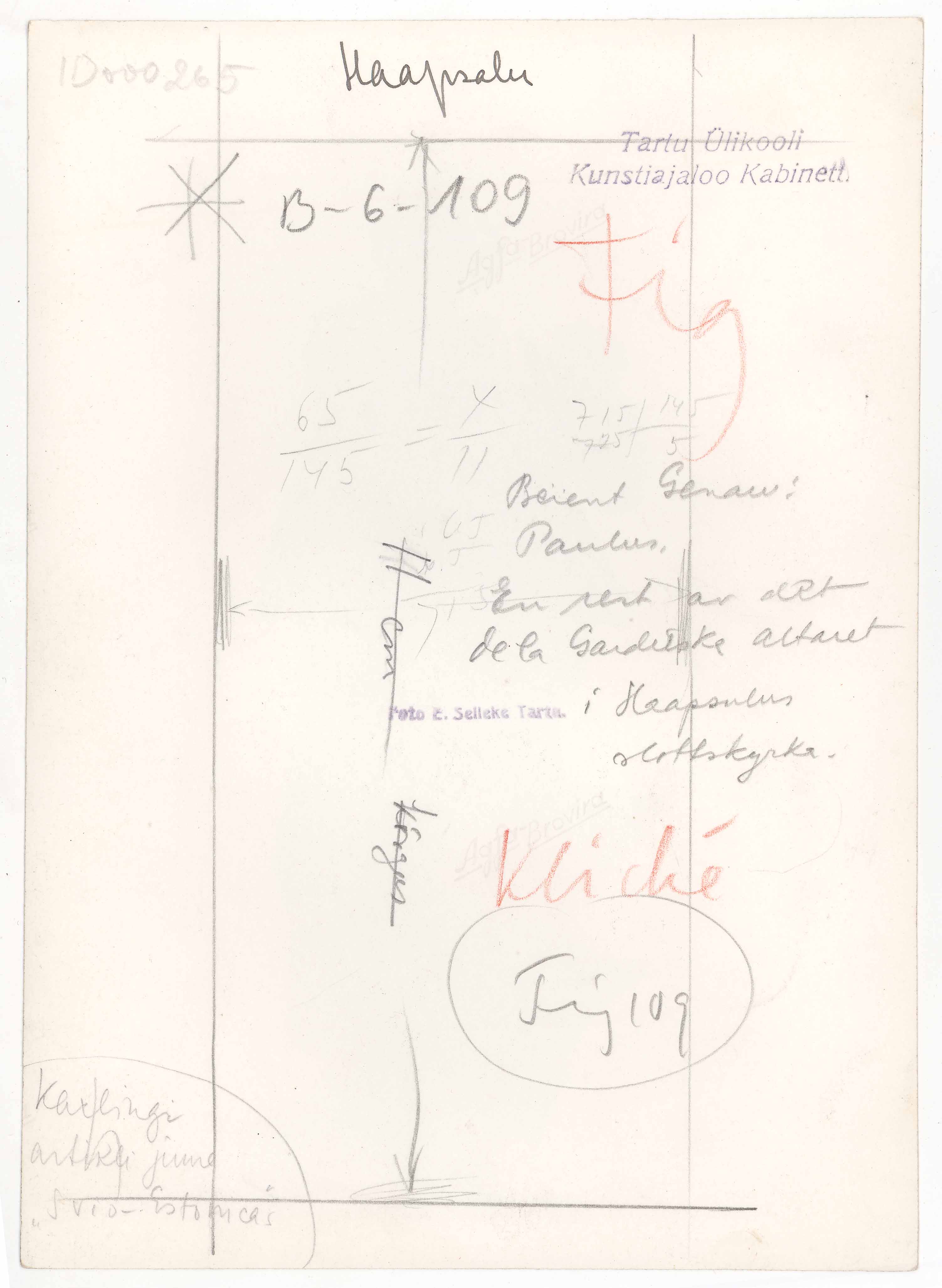 Tekst foto tagaküljel: Haapsalu. [Karlingi märkused] Karlingi artikli juure "Svio-Estonicas". Templid: Kabinett; E. Selleke