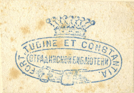 | dc.description | Ovaalne vööna kujundatud tempel ja kroon. Joonises keskel: ОТРАДИНСКОЙ БИБЛİОТЕКИ vööl ovaalselt deviis: FORTITUDINE ET CONSTANTIA. | |