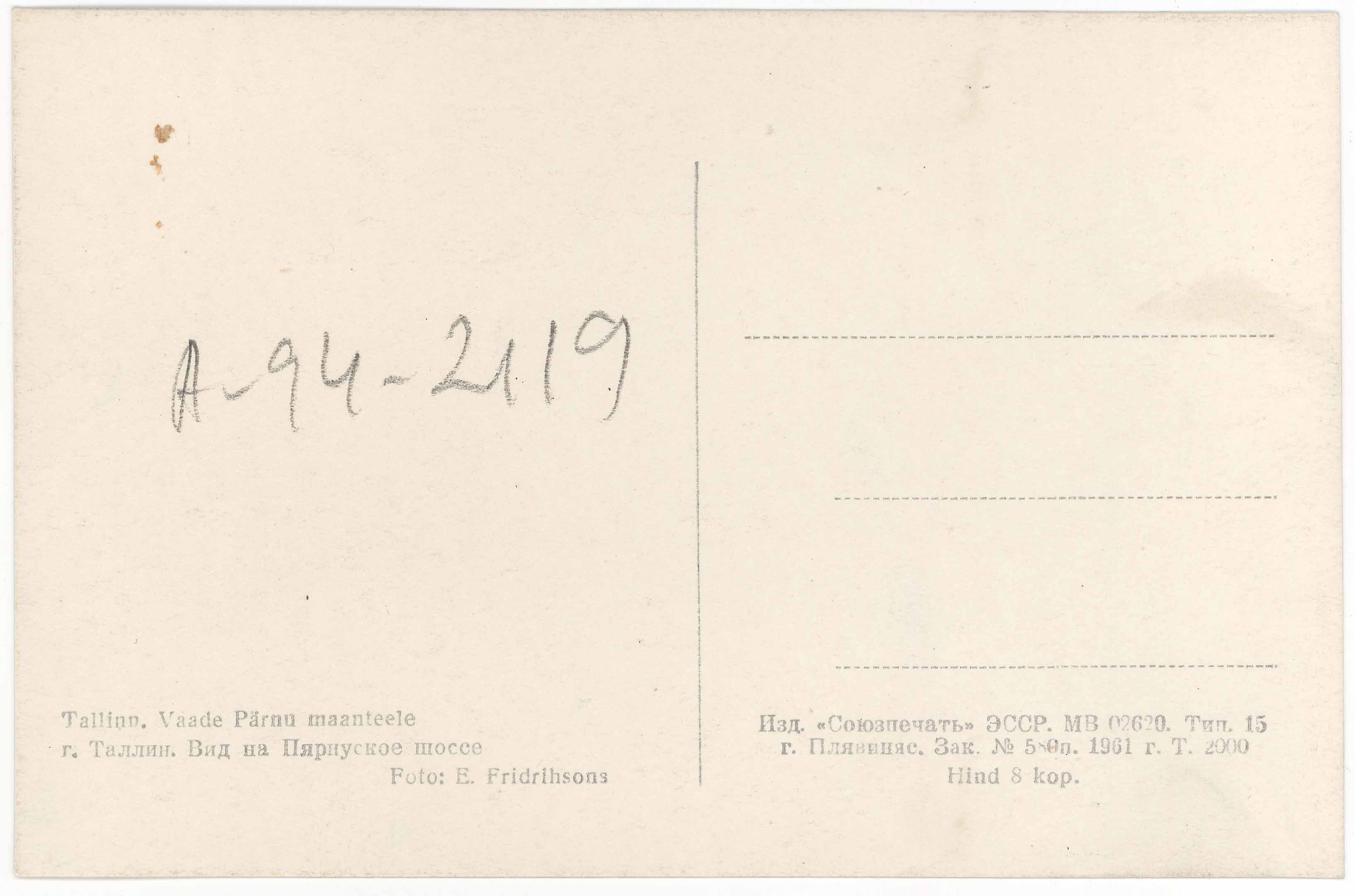 Tekst foto tagaküljel: Tallinn. Vaade Pärnu maanteele. Foto: E. Fridrihsons