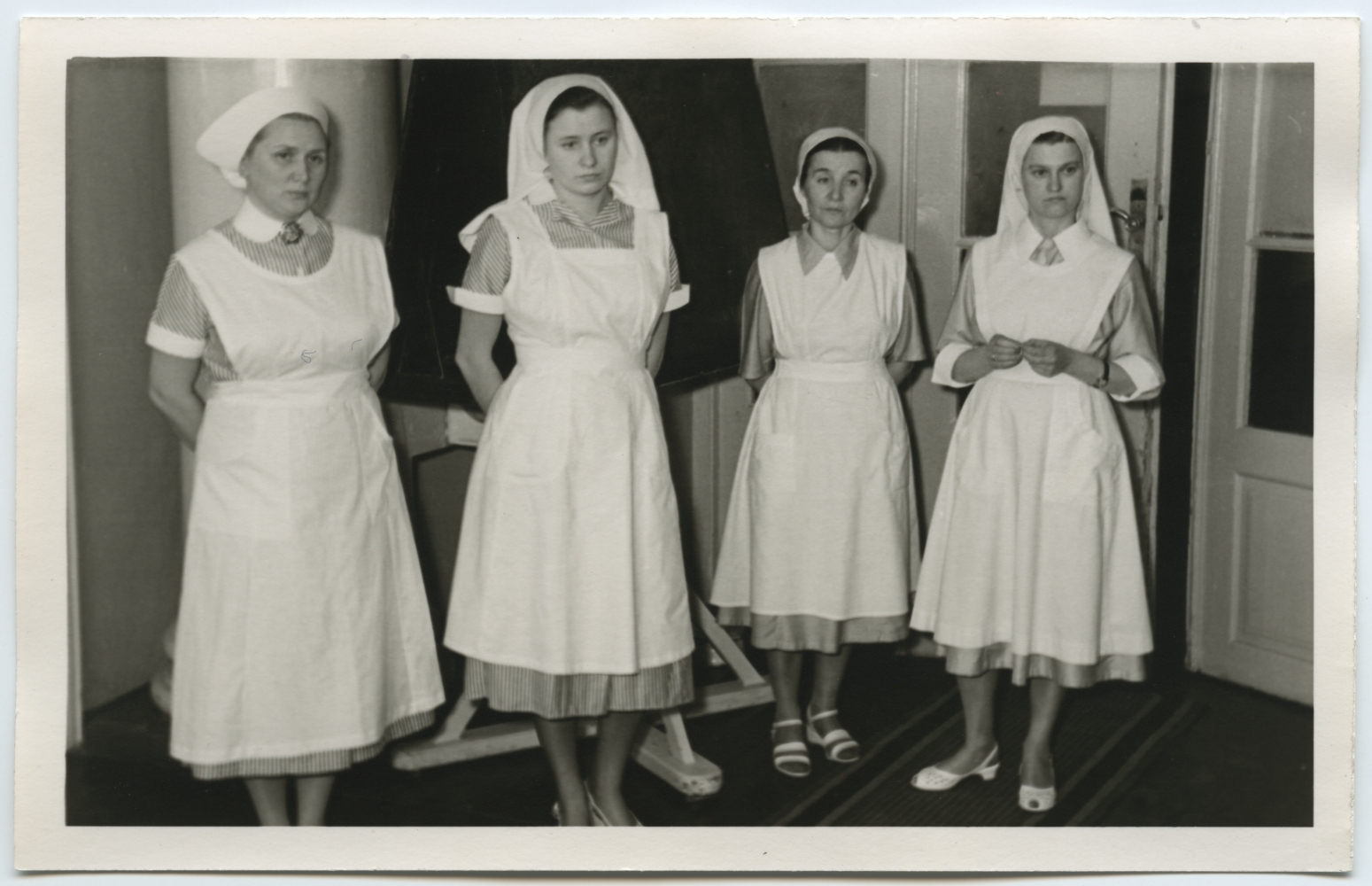Õe ja sanitari ametiriietuse demonstratsioon Tartu Linna Kliinilise Haigla sisehaiguste osakonna auditooriumis 28. veebruaril 1959. a.