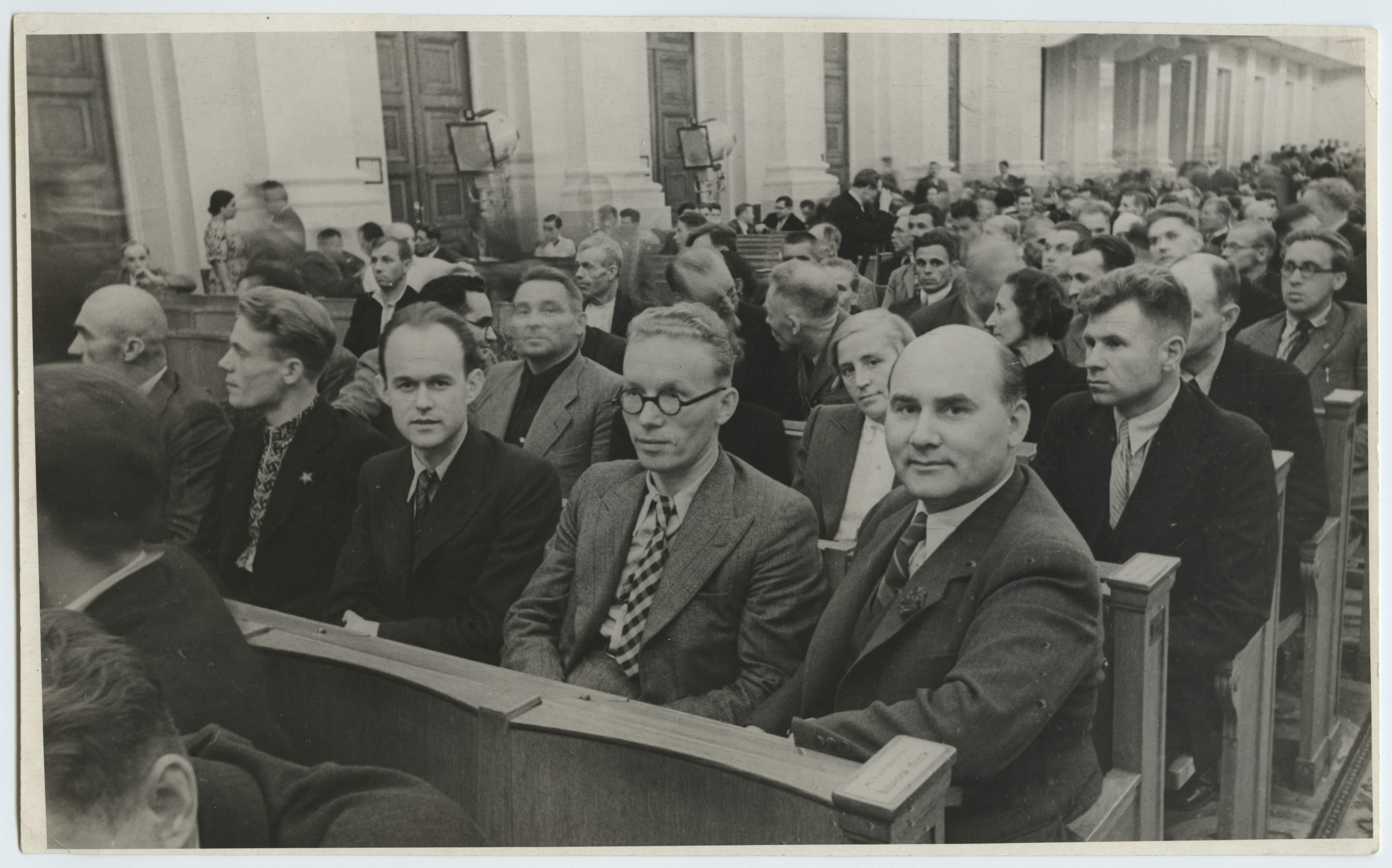 | dc.description | Esiplaanil saalis istumas paremalt: Johannes Vares, Johannes Lauristin, Neeme Ruus | |