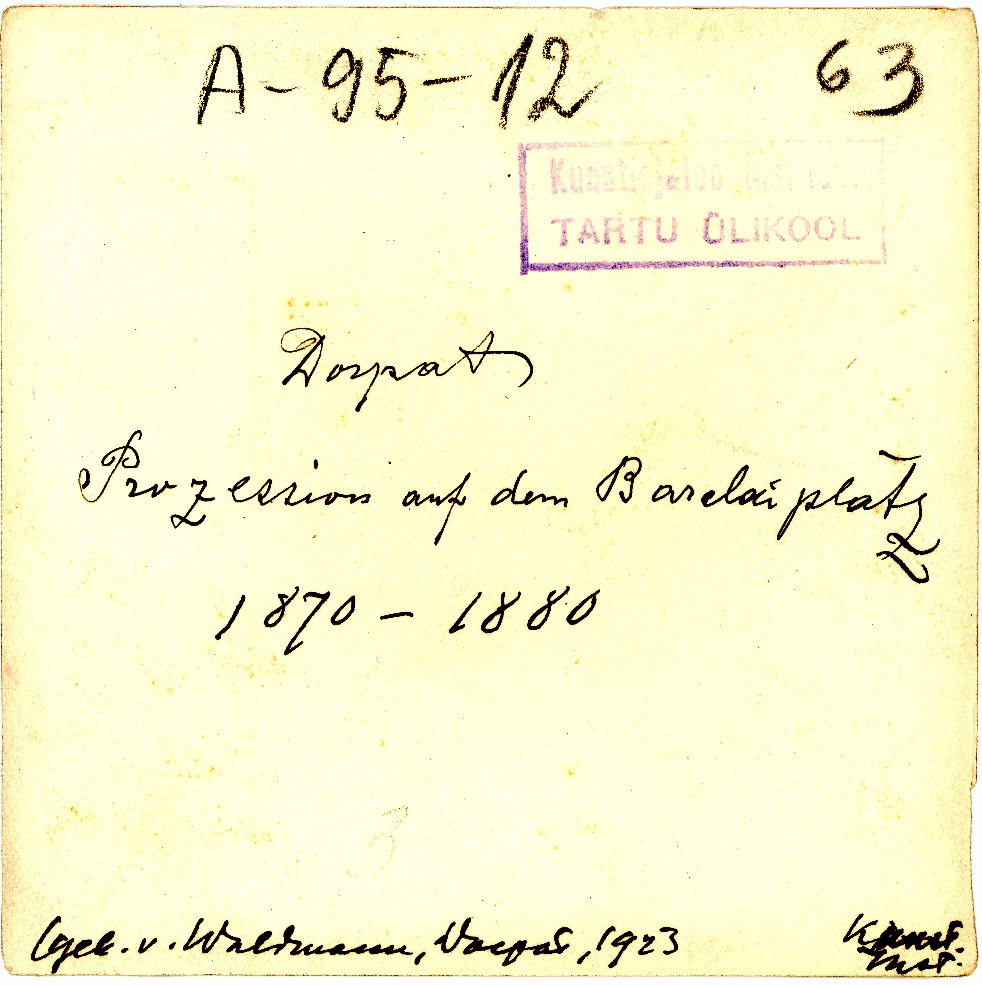 Tekst foto tagaküljel: Dorpat. Prozession auf dem Barklaiplatz. 1870-1880. (gek v Waldmann, Dorpat, 1923) Kunst. Inst. Tempel: Instituut