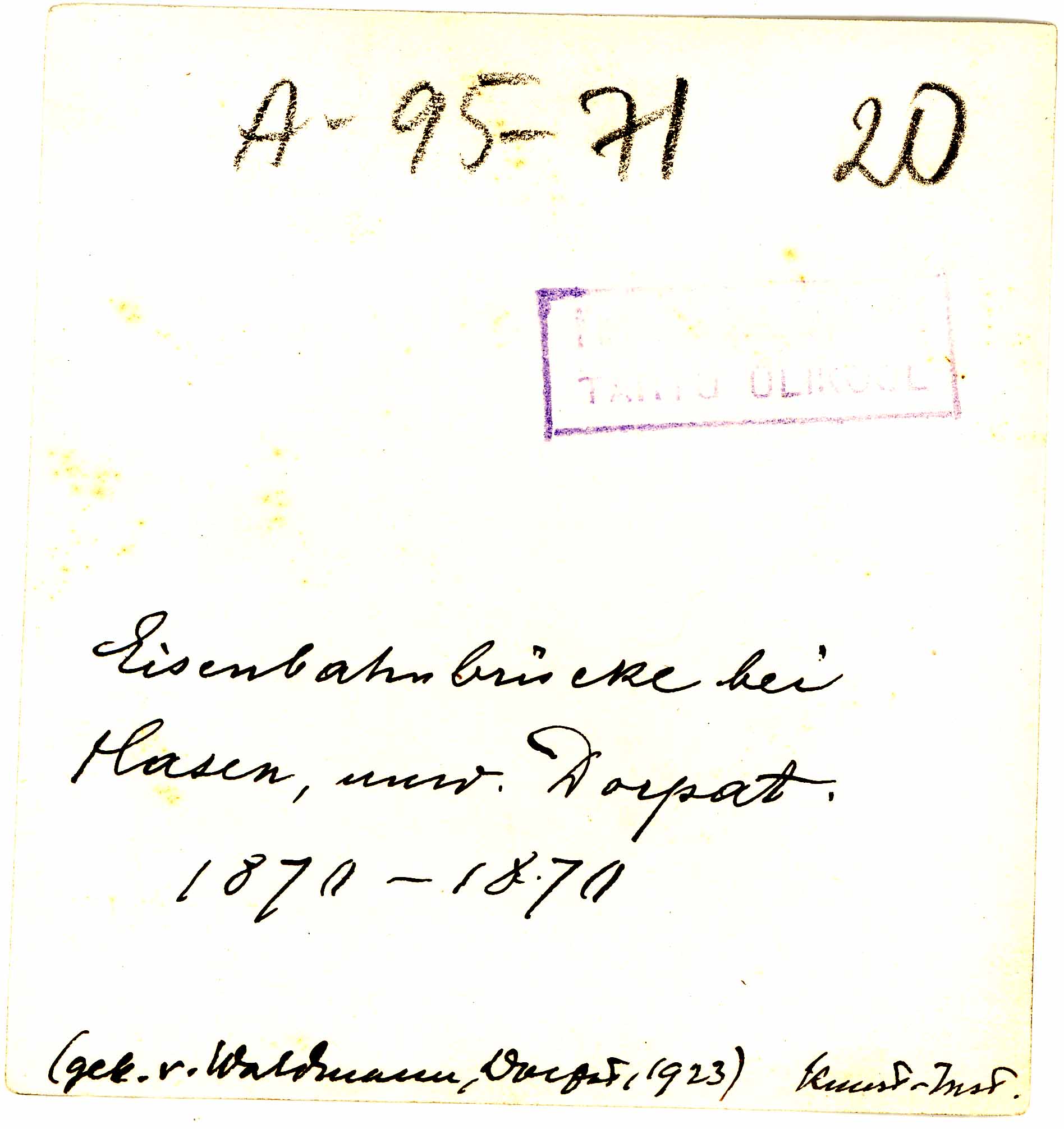 | dc.description | Tekst foto tagaküljel: Eisenbahnbrücke bei Hasen, umg Dorpat. 1870-1880. (gek v Waldmann, Dorpat, 1923) Kunst. Inst. Tempel: Instituut | et |