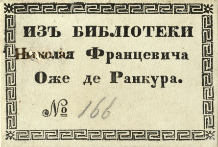 | dc.description | Nelinurkses ornamenteeritud raamistuses: ИЗЪ БИБЛIОТЕКИ / Николая Францевича / Оже де Ранкура. / № | |