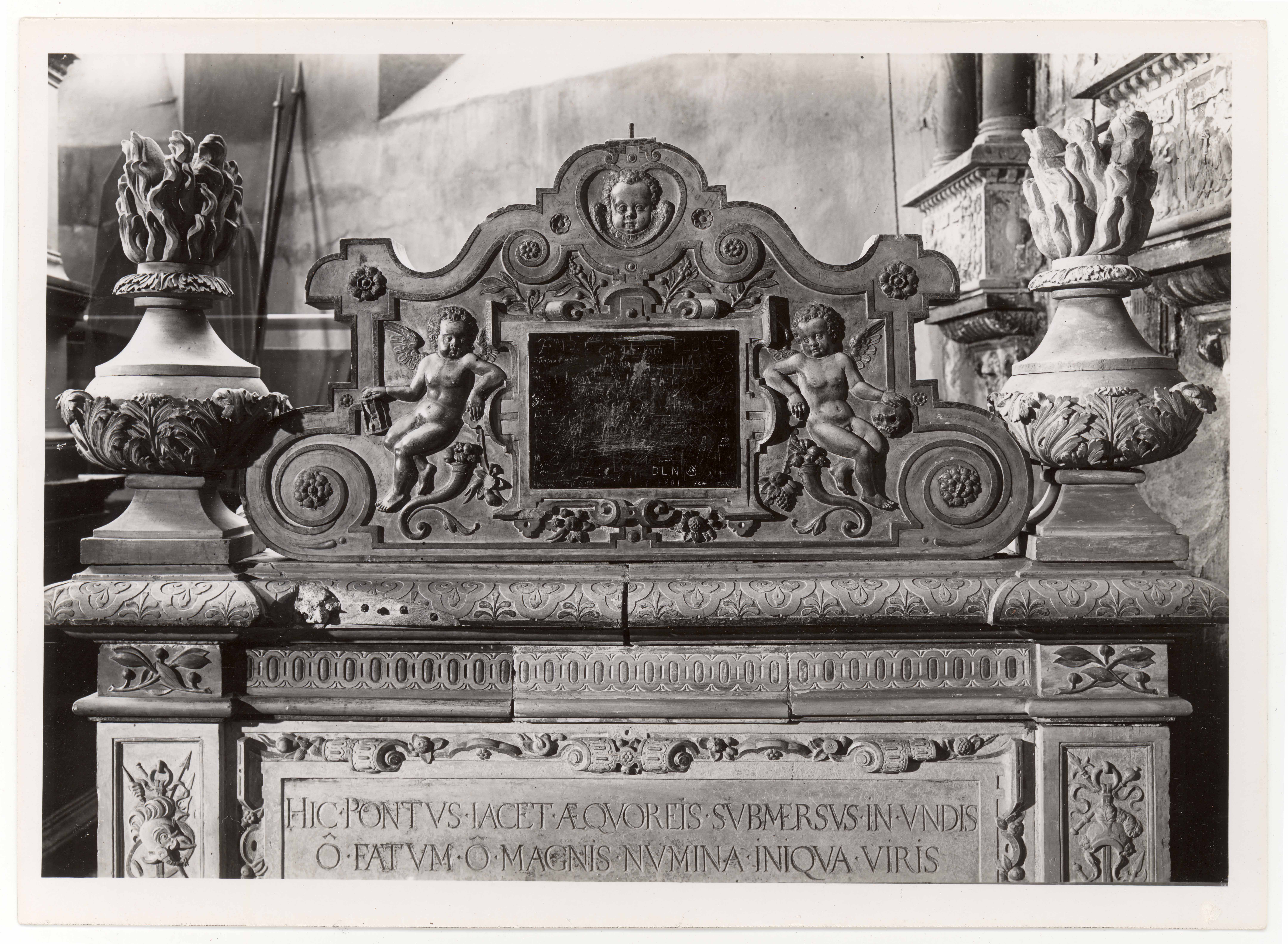 Tallinn. Toomkirik. Pontus de la Gardie hauamonumendi sarkofaagi parempoolse külje ehisviil putodega