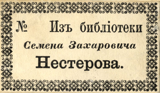 | dc.description | Nelinurkses ornamenteeritud raamistuses: № Изъ библiотеки / Семена Захаровича / Нестерова. | |