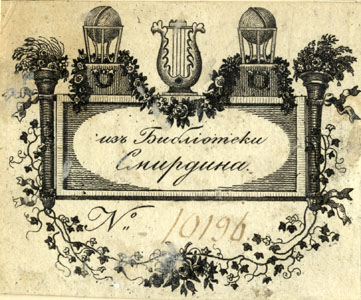 Keskel nelinurkne tahvel, selle kohal lüüra kahe gloobuse vahel, ümberringi lillevanik. Joonises keskel tahvlil: изъ Библiотеки / Смирдина. all vasakul: N°;"Иваск